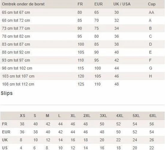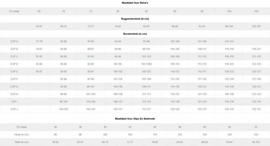 | Maat | 105B, 70D, 70E, 70F, 70G, 75B, 75C, 75D, 75E, 75F, 75G, 80B, 80C, 80D, 80E, 80F, 80G, 85B, 85C, 85D, 85E, 85F, 85G, 90B, 90D, 90E, 90F, 90G, 95B, 95D, 95E, 95F, 100C, 100D, 100E, 105C, 70C, 90C, 95C, 100B, 105D |