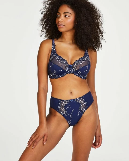 Deze niet-voorgevormde beugel bh is uitgevoerd in een ondoorzichtige stof en aan de bovenzijde afgewerkt met semi-transparant kant. De cups zijn versierd met een elegant bloemenpatroon. Maak je set compleet met de bijpassende Diva slip.