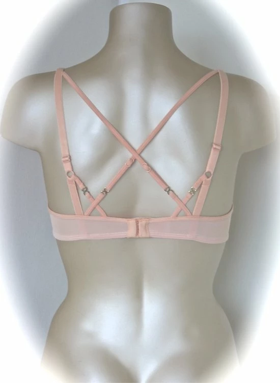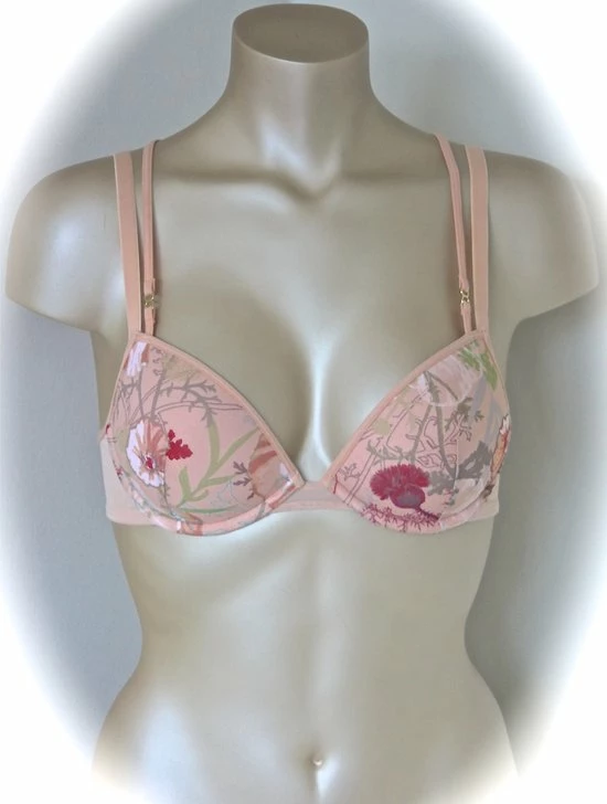 Zalmroze push up bh met bloemenprint uit de serie ‘Wild Bouquet’. Aan de voorzijde heb je dubbele bandjes, aan de voor- en achterzijde worden de smalle bandjes onderbroken door goudkleurige elementjes.