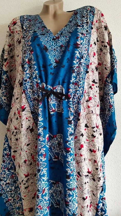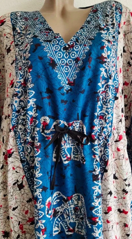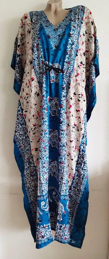 Een heel mooie kaftan met prachtige opdrukken en een aantrekkoord voor jong en oud. De kaftan draagt heel luchtig en zeer comfortabel. Het materiaal van de kaftan voelt ook lekker aan en is van 100% viscose. De lengte van de kaftan komt tot aan je enkel en is 130cm lang en 82cm breedt. De maat valt naar 36-50. Wasbaar op 30 graden. Of met de handwas.