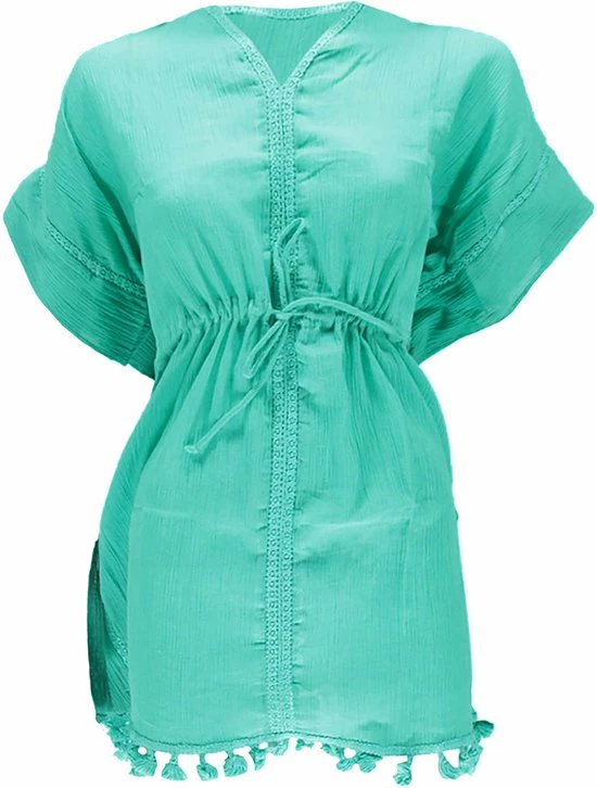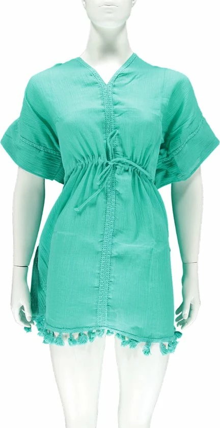 Dit leuke zomerjurkje, Turquoise overtop over je bikini of badpak maar ook erg leuk over een short legging. Tal van mogelijkheden dus. Dit strandjurkje heeft 1 maat en is voorzien van een leuk rijgband waardoor je hem naar wens kan dragen.